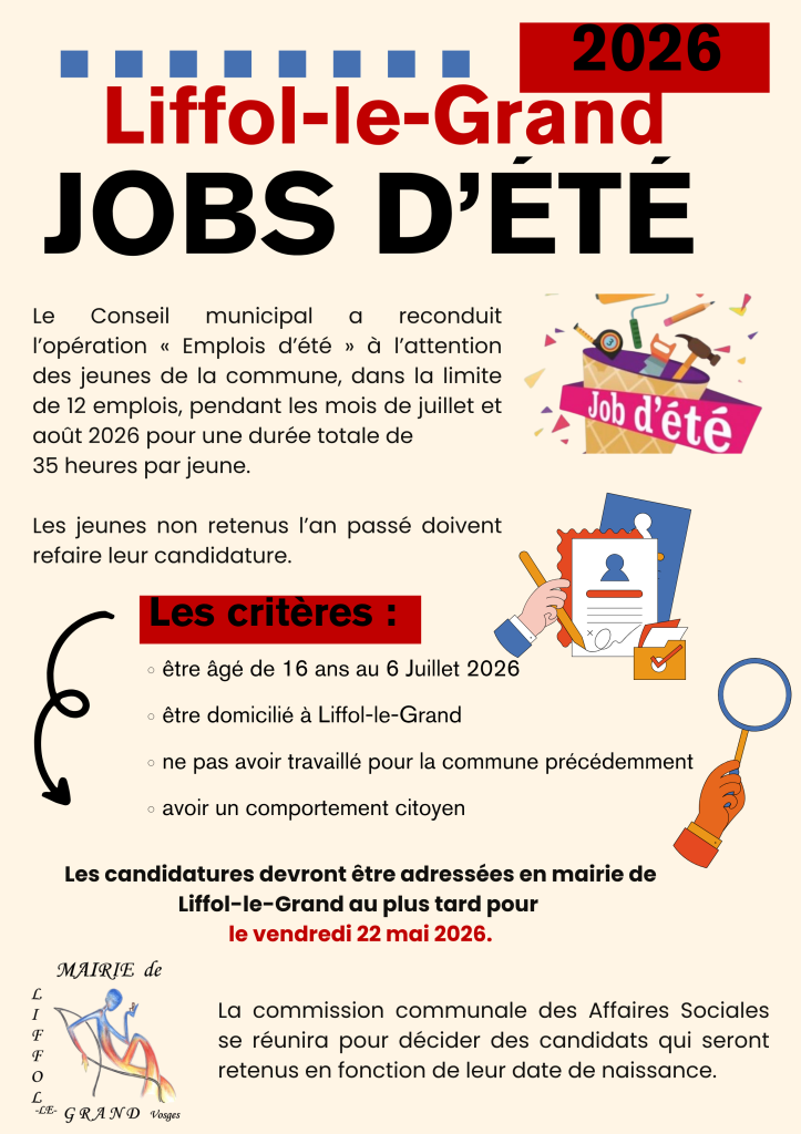 Tu as 16 ans (ou tu auras 16 ans avant le 6 juillet 2026), tu vis Ă Liffol-le-Grand et tu cherches un job d’Ă©tĂ© ? Les candidatures sont ouvertes jusqu’au vendredi 22 mai 2026.