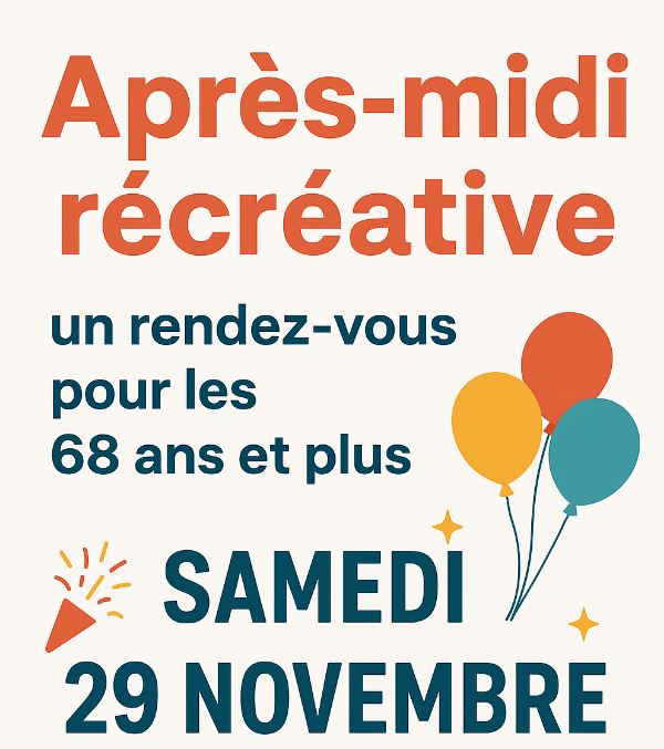 Comme chaque année, nous avons convié nos habitants âgés de 68 ans et plus (ainsi que les personnes handicapées) à participer à une après-midi récréative qui aura lieu le samedi 29 novembre.Cette édition sera animée par Bibi Milési et Allan et intitulée « Show rétro 2 »