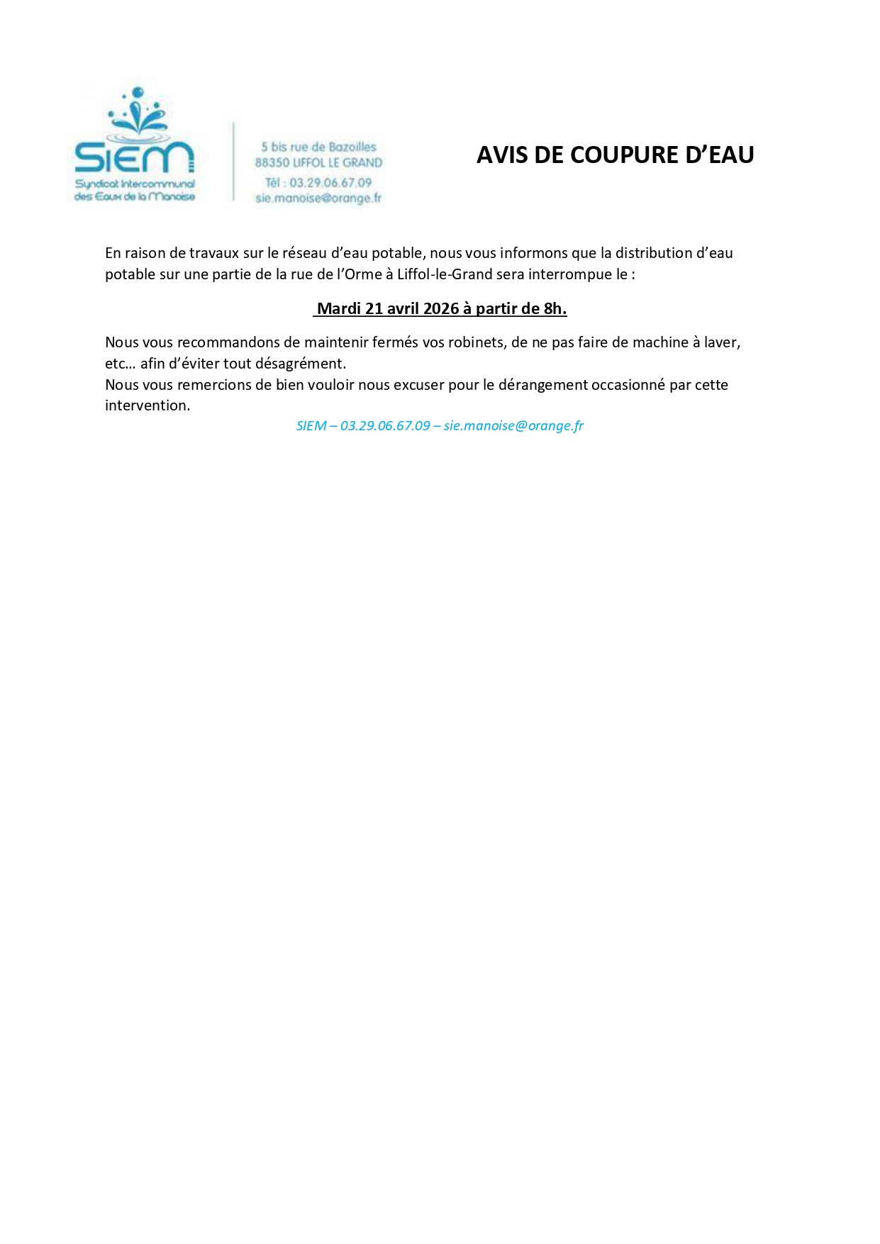 💧 Avis de coupure d’eau 💧 Avis de coupure d’eau ⚠️ Nous vous recommandons de : maintenir vos robinets fermés éviter de faire fonctionner les appareils électroménagers (machine à laver, etc.)