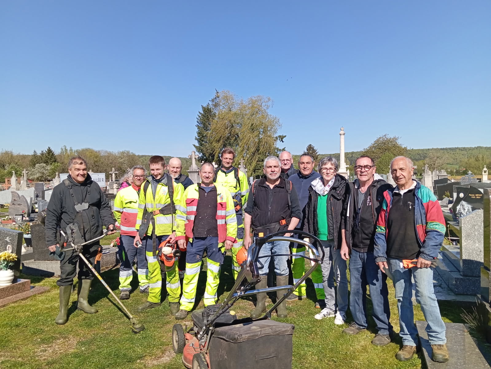 La commune tient à adresser ses sincères remerciements à l’ensemble des agents, élus, bénévoles/administrés mobilisés lors de l’action citoyenne de tonte et d’entretien du cimetière organisée le mercredi 22 avril 2026.