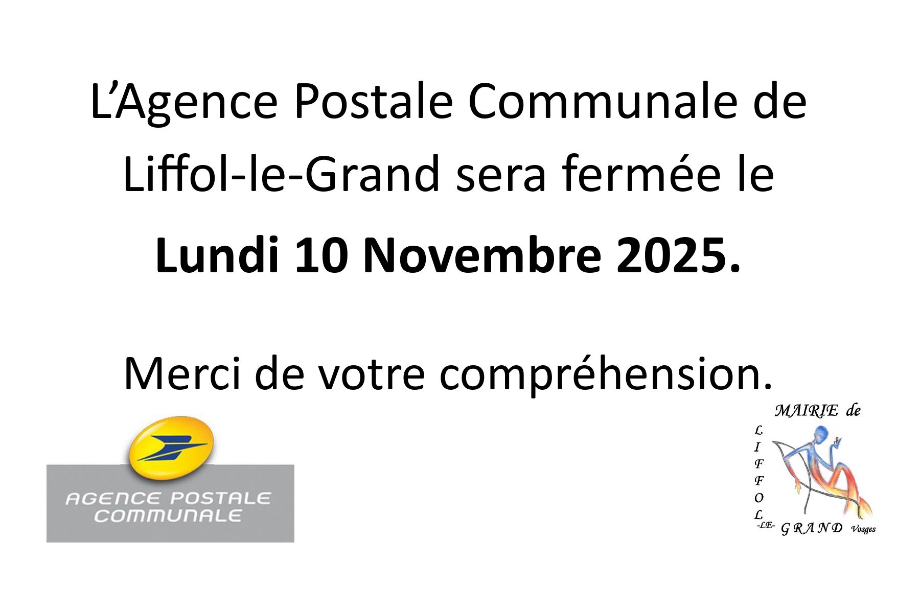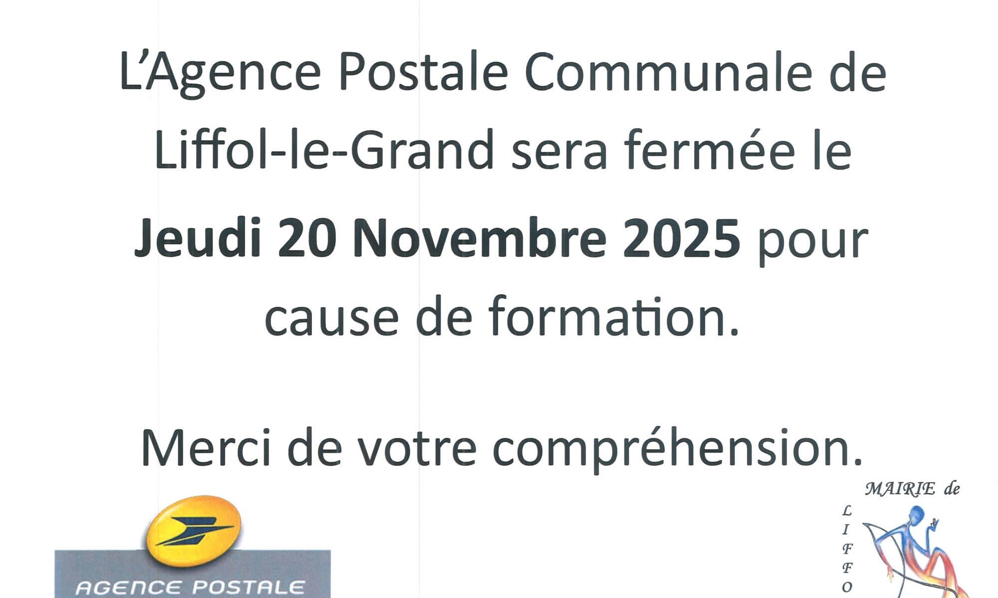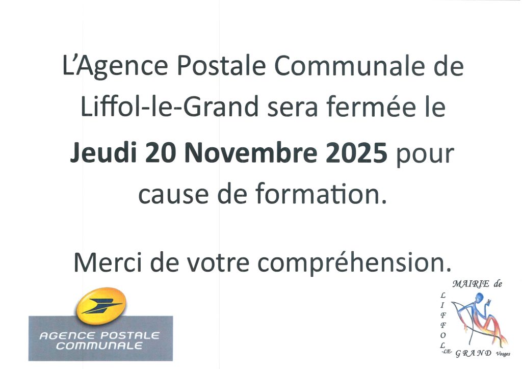 L’Agence Postale Communale sera fermée le jeudi 20 novembre 2025 pour cause de formation.