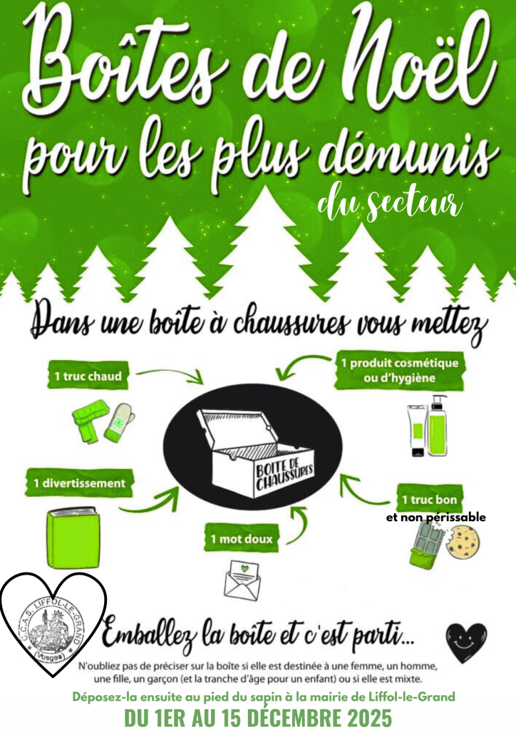 👉 Déposez votre boîte de Noël au pied du sapin, dans le hall de la mairie de Liffol-le-Grand.