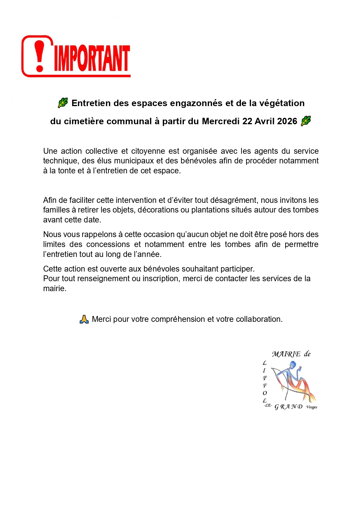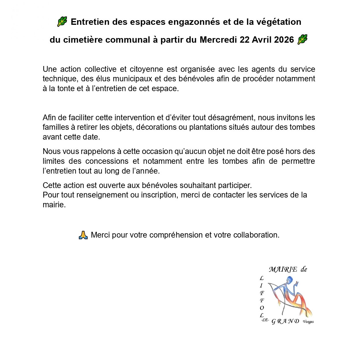 🌿 Action citoyenne au cimetière – Mercredi 22 avril 🌿