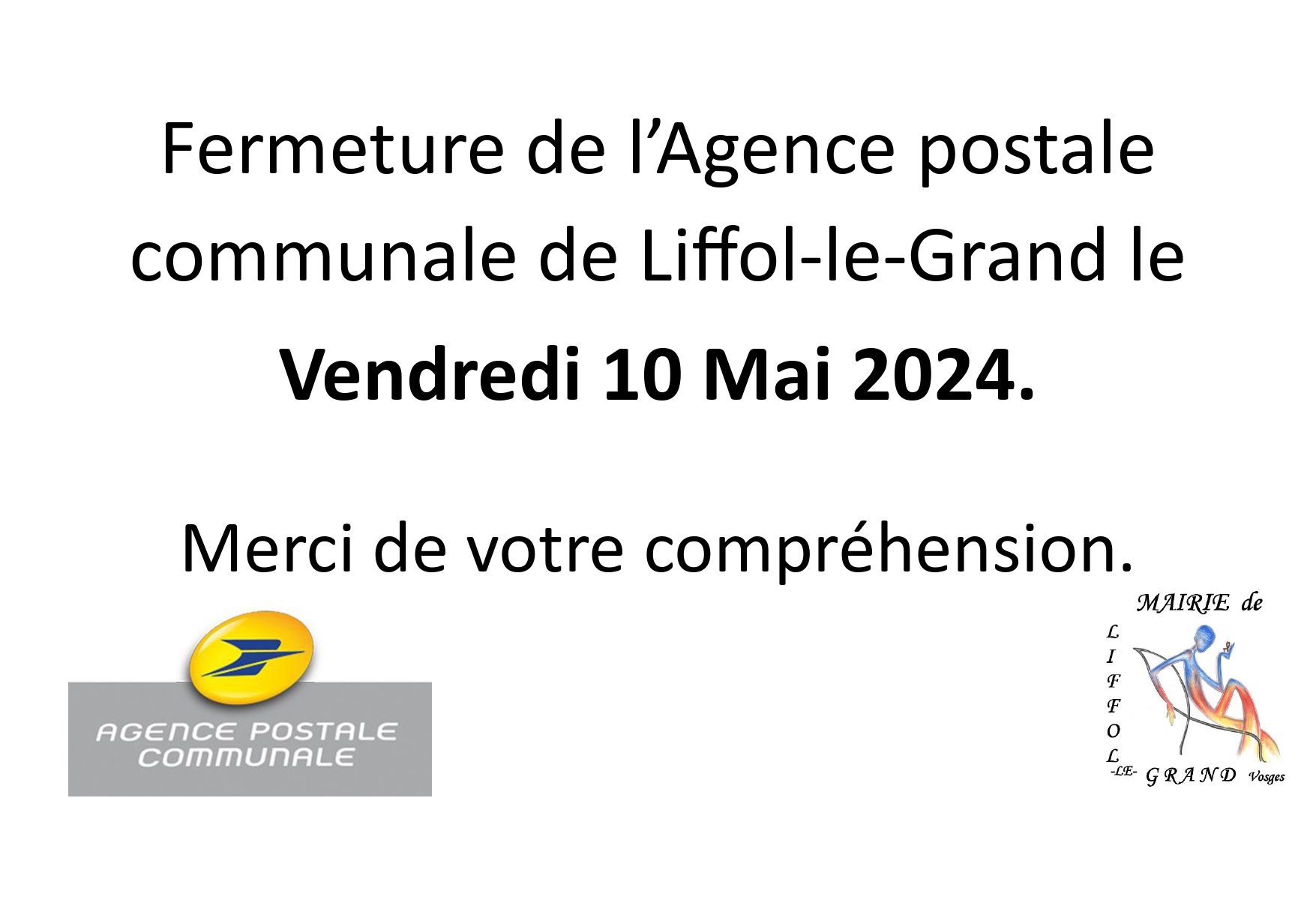 L’agence postale communale sera fermée le vendredi 10 mai 2024.