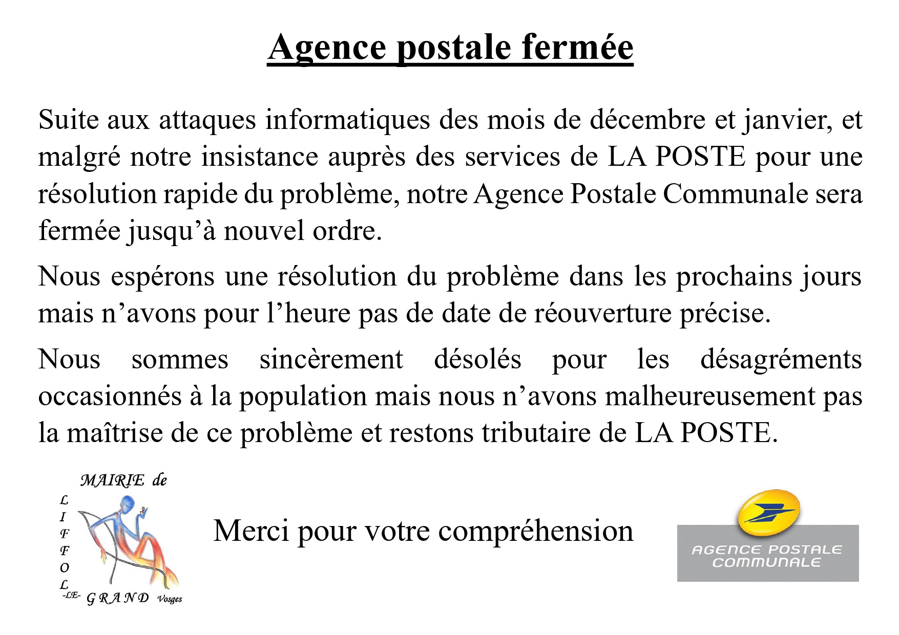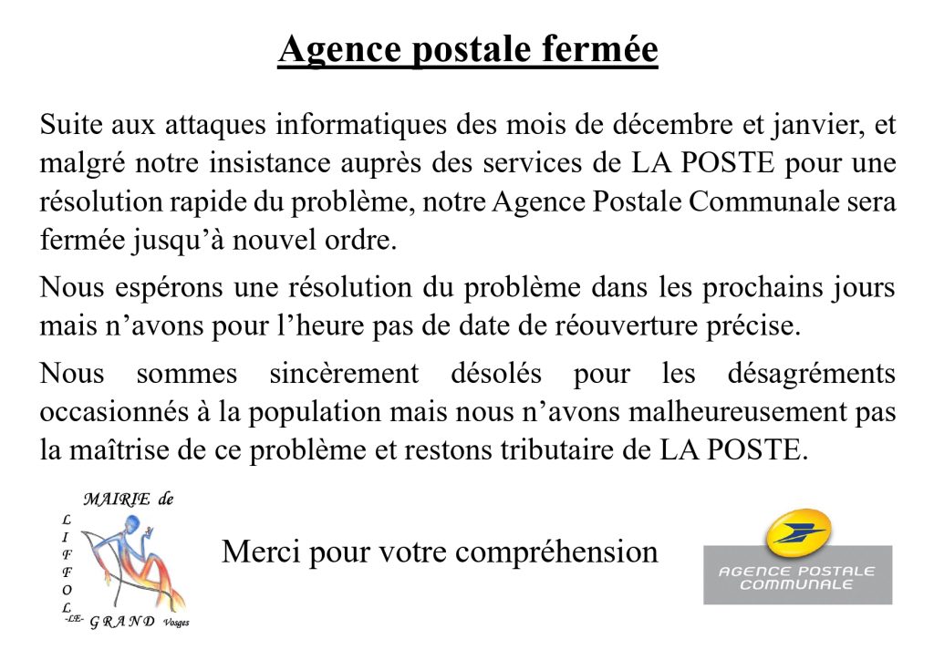 Fermeture temporaire de l’agence postale