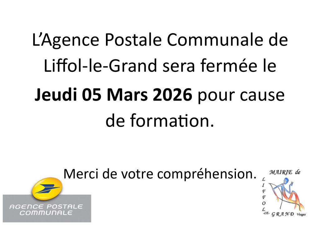 L’Agence Postale Communale de Liffol-le-Grand sera fermée le jeudi 5 mars 2026.