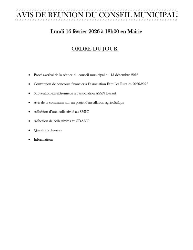 Le prochain conseil municipal sera le lundi 16 février à 18h00 en mairie !
